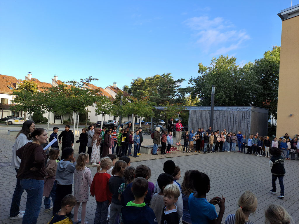 Im Rahmen der beiden Aktionswochen "Zu Fuß zur Schule" traf sich die ganze Schulgemeinde auf dem Vorplatz, um gemeinsam zu singen, warum es wichtig ist zu Fuß zur Schule zu gehen. Unter "Schulwegsicherung" finden Sie zudem weitere Infos.