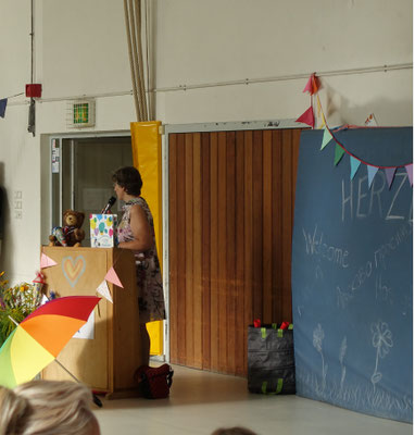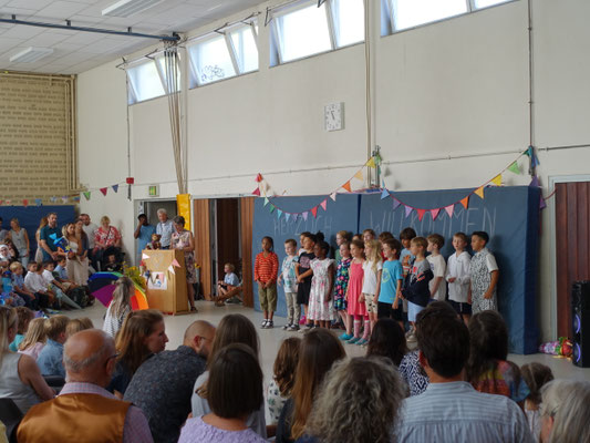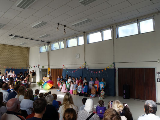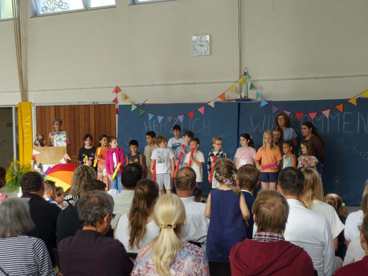 Die Kinder der 4a starteten mit einem umgeschrieben Text auf ein sehr bekanntes Lied. Anschließend zeigte die 2b, wie man mit Boomwhackers zusammen ein Lied rhythmisch begleiten kann. Die Klasse 4c begeisterte mit einem Rap und die 4b läutete mit einem Verabschiedungslied in den eigentlichen Abschied ein.