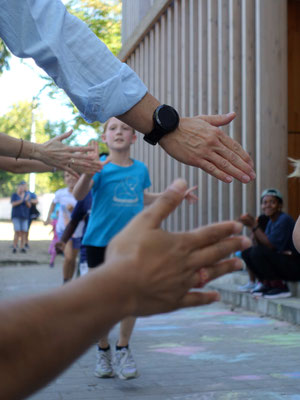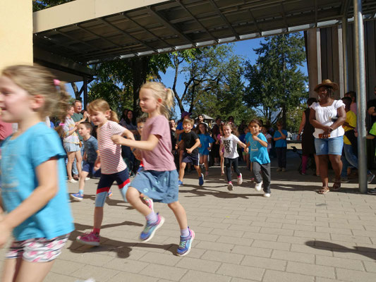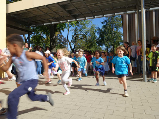 Heute war es wieder soweit. Sportlich angezogen und aufgeregt wartete ein Großteil der Schülerinnen und Schüler und auch einige Lehrkräfte und Betreuungskräfte darauf, dass ihr Jahrgang an den Start gebeten wurde. Jeder Jahrgang hatte 20 Minuten Zeit eine ca. 400 Meter lange Strecke rund um die Schule so oft wie möglich zu laufen. Für jede gelaufene Runde gab es am Start-/Zielbereich einen Strich auf den Arm.