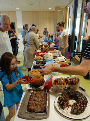 Danach waren die Spielestationen und das reichhaltige internationale Buffet eröffnet. Die Kinder hatten die Möglichkeit zwischen vielen unterschiedlichen Angeboten zu wählen: Lehrkräfte malen, Einschulungsfotos der Lehrkräfte erraten, die Rollenrutsche ausprobieren, um die Wette Sackhüpfen, Eierlauf und Mülltonnenrennen, Kerzen ausspritzen, ...